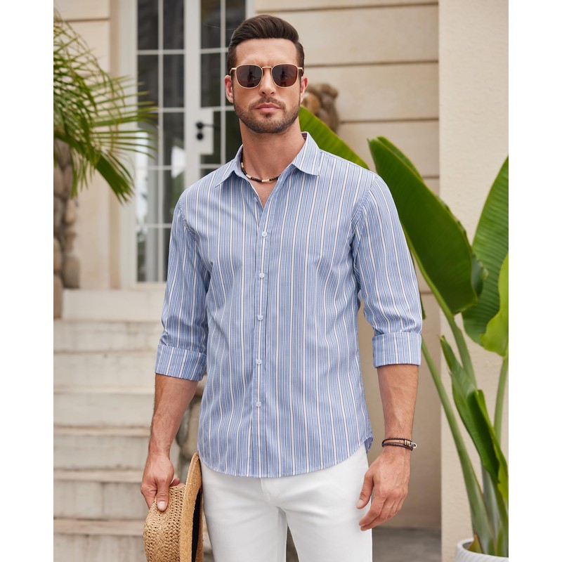 - High quality Fabrics: Our mens long sleeve button down shirts is made of special high-quality fabric,including 97% Polyester and 3% Spandex. This long sleeve dress shirts for men Crafted from breathable, soft, and skin friendly fabric, providing a super comfortable experience all day long. Our mens button down shirt design goes beyond solid colors, paired with fashionable stripes to create a fresh look.