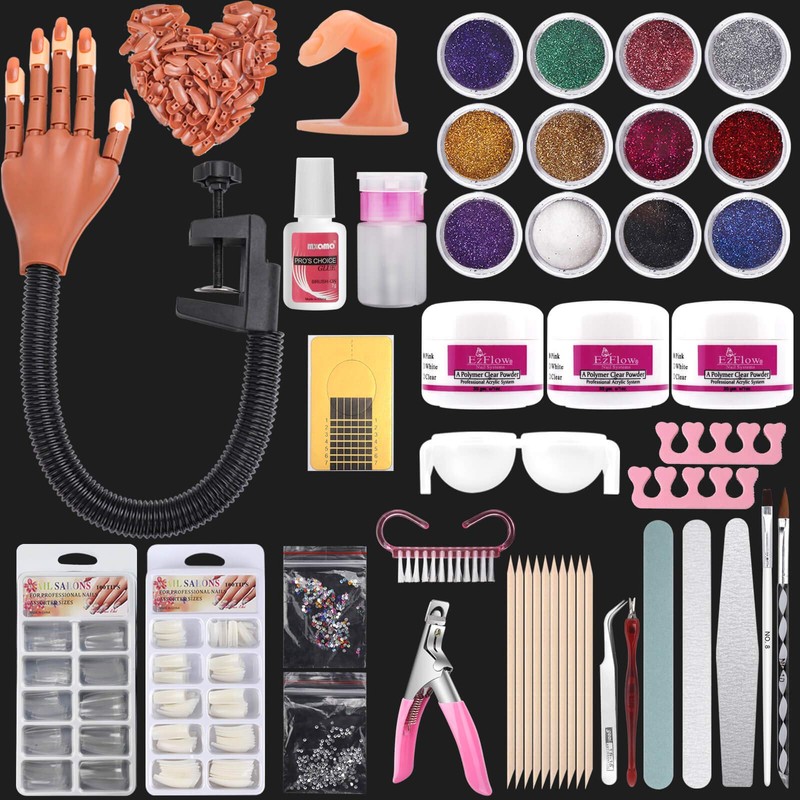 - Professional Acrylic Nail Kit Set-This set come with Nail Practice Hand,Nail practice finger,Acrylic powder(clear/white/pink),Nail glue,Varied colors of rhinestone,pearl,French tips,Cleaning brush,Nail file,Nail seperator,Nail guide sticker forms,nail cutter,Curved tweezer,Nail art decorations dotting pen