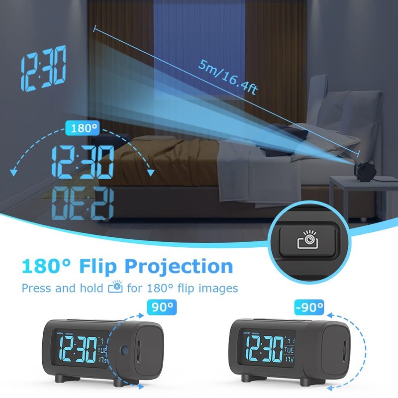 - [180 ° projection alarm clock & Large VA Screen]: LIORQUE Projection Alarm Clock has 180° rotable projector. Note: Long press the “Projection” button to flip projection view upside down. Large VA display protects your eyes from too bright clock light and ensures clear time display with 4 levels of brightness.