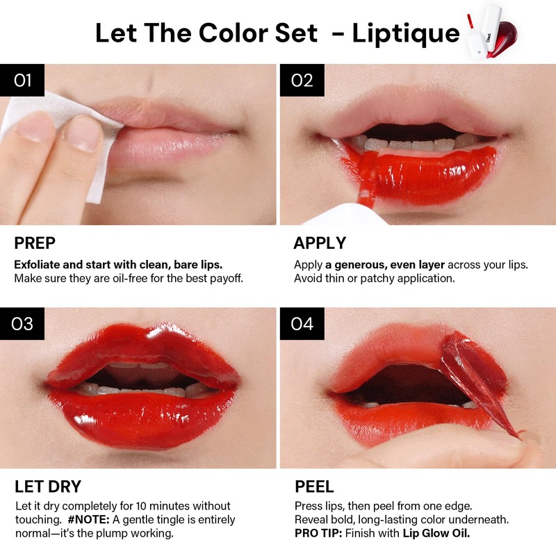 - [How to Use] On clean, oil-free lips, apply the lip stain evenly using the applicator, and after 5–10 minutes, gently peel it off to reveal a natural tint. The elastic silicone applicator allows for easy control of the product amount and helps evenly apply along the lip line. After use, apply Oiad Lip Glow Oil or lip balms for a more vibrant and glossy finish