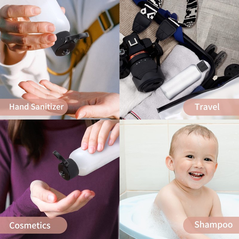 - Portátil: los dispensadores de tapa abatible son perfectos para champú, tónico facial, loción, aceite esencial, aceite removedor de maquillaje, cosméticos. Es portátil, puedes ponerlos en tu bolso o bolsillo y llevarlos a cualquier lugar