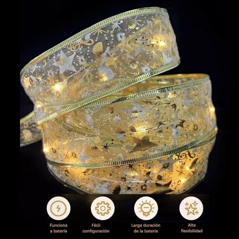 Listón Dorado Liston Navideño Decorativo Con Luces Led 5 Metros 2pzs