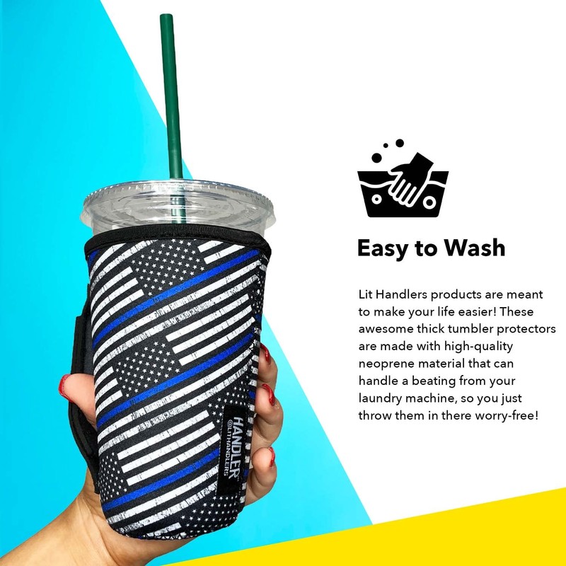 - The Lit Handlers Sleeve for Everyone: Our patent-pending lit holder with handle and pocket comes in different prints and designs to choose from. The machine-washable fabric makes our tumbler sleeve with handle easy to clean.