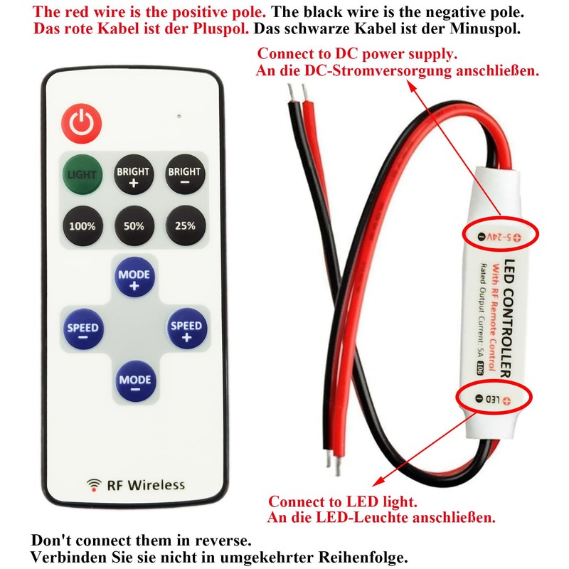 1. Please check the two ends of the receiver, one end labeled "5-24V" is for connecting the power supply, the other end labeled "LED" is for connecting the LED light. Please do not connect the two ends of the receiver incorrectly, otherwise the remote will not work.