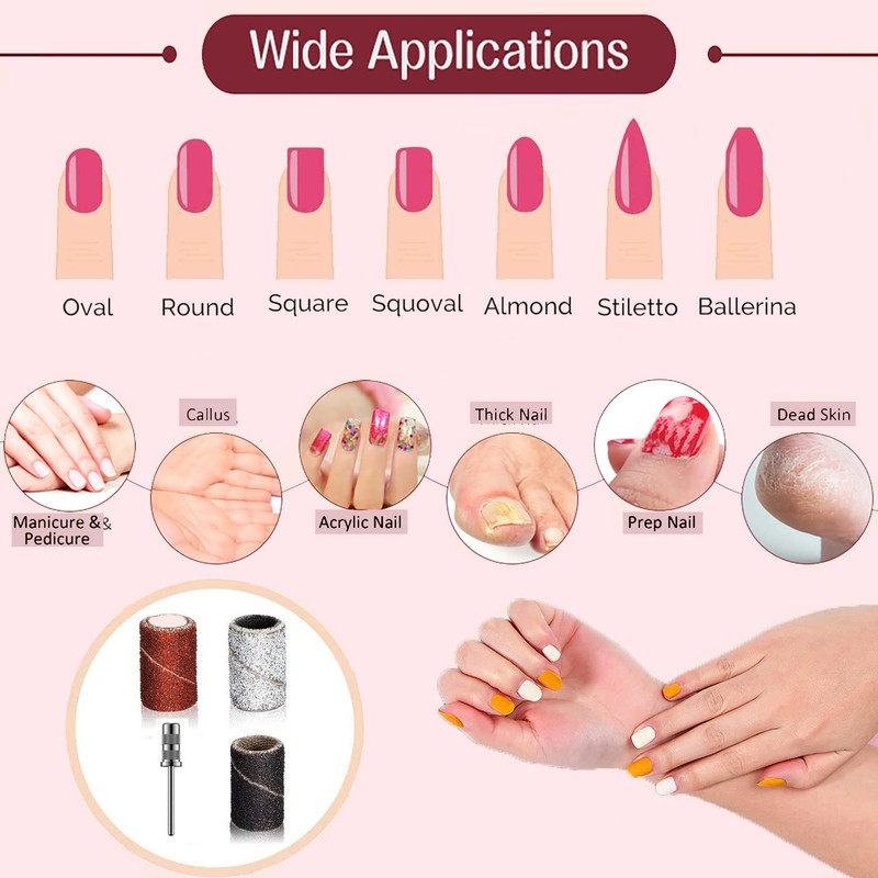 - Wide range of applications: the nail sand set is very light and easy to carry. Apply to natural nails, thick false nails, false nails, acrylic nails, gel nails, etc., the surface of the nails can be polished and the nails can be shortened. It can be used for carving, grinding, milling, grinding, polishing, smoothing, rubbing nails, removing nail polish, removing cuticles etc.