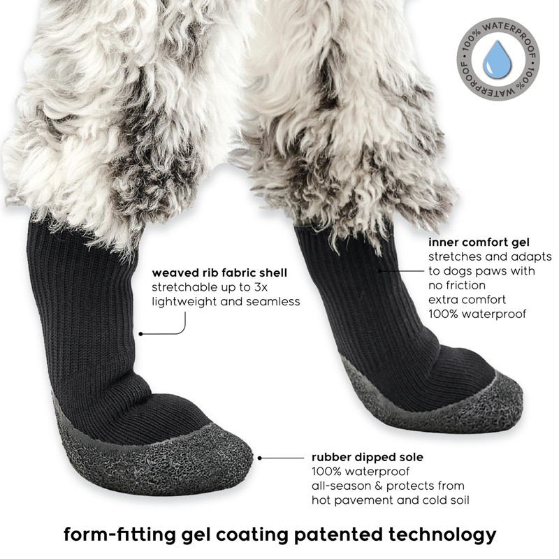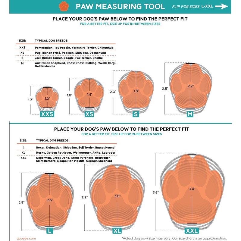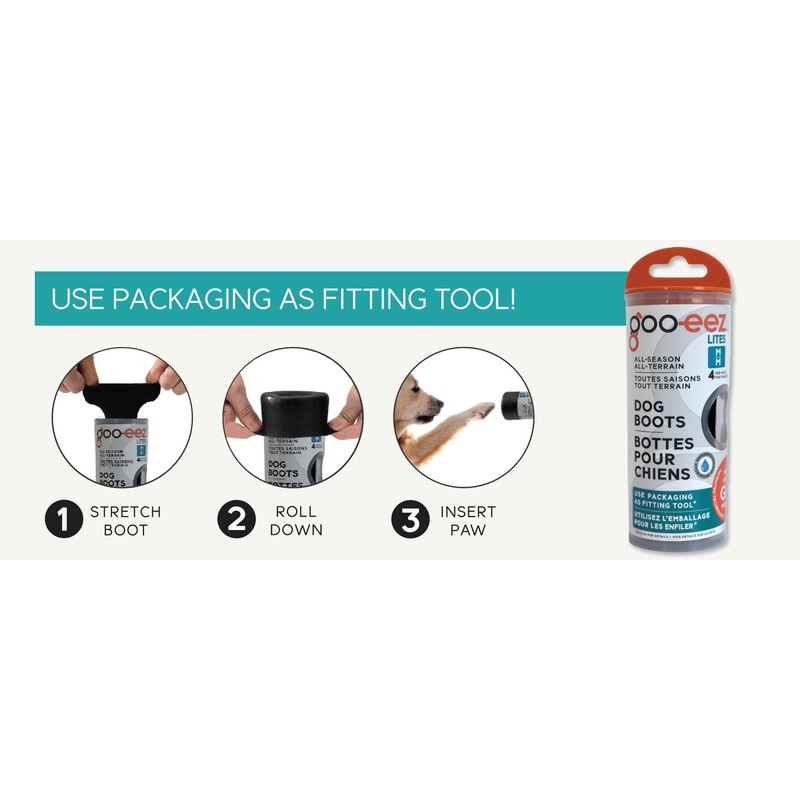 - Goo-eez Dog Boots fit like a human compression sock, offering a snug, flexible fit that reduces joint impact and adds a bounce to every step. Perfect for active pups or those needing joint support, these durable, breathable boots protect against harsh elements while keeping your dog comfortable on any adventure.