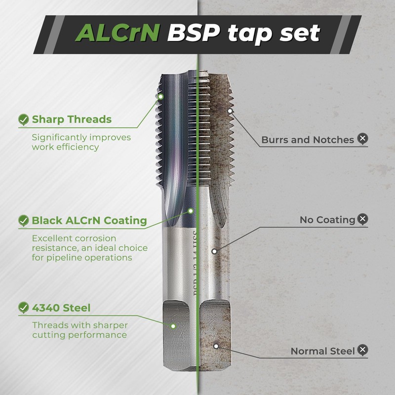 - This product is made of high - quality 4340 steel and coated with black ALCRN:The characteristics of 4340 steel endow the tap threads with sharper cutting performance. The ALCRN coating has excellent corrosion resistance. Even in harsh liquid - contact environments for a long time, it can not only ensure that the taps do not rust, but also maintain the sharpness of the threads all the time, making it an ideal choice for pipeline operations.