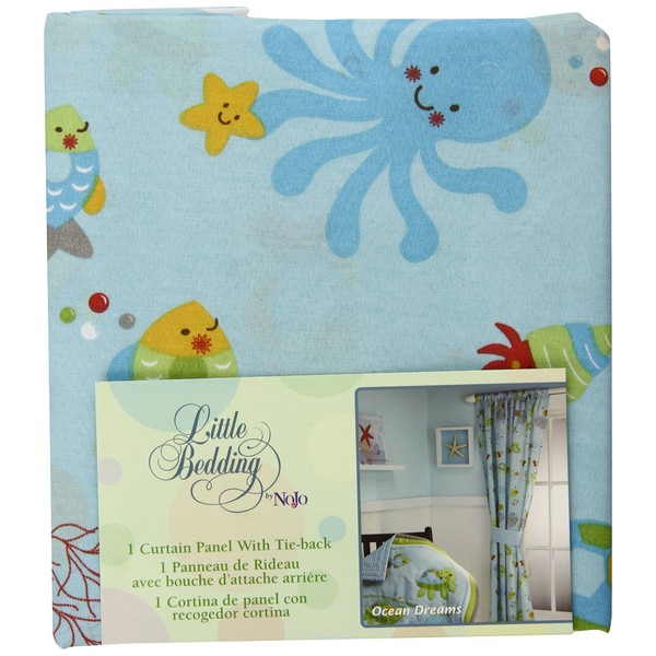 Little Bedding Ocean Dreams Curtain Panel includes 1 panel and 1 tie back. Tie back is light aqua wave print. Panel is featured in all over mini print of our undersea friends, octopus, turtles, jellies, hermit crabs and more. Comes in cool breeze colors of soft aqua, ocean green, marigold, sea blue and a pop of coral red/orange. Panel measures 41"W x 63"L, includes a 3" rod pocket. Fits most standard curtain rods. Blended fabrics are 55% Cotton / 45% Polyester. Machine wash separately in cold water, gentle cycle. Use only non chlorine bleach when needed. Tumble dry low heat. Iron on low heat when needed.