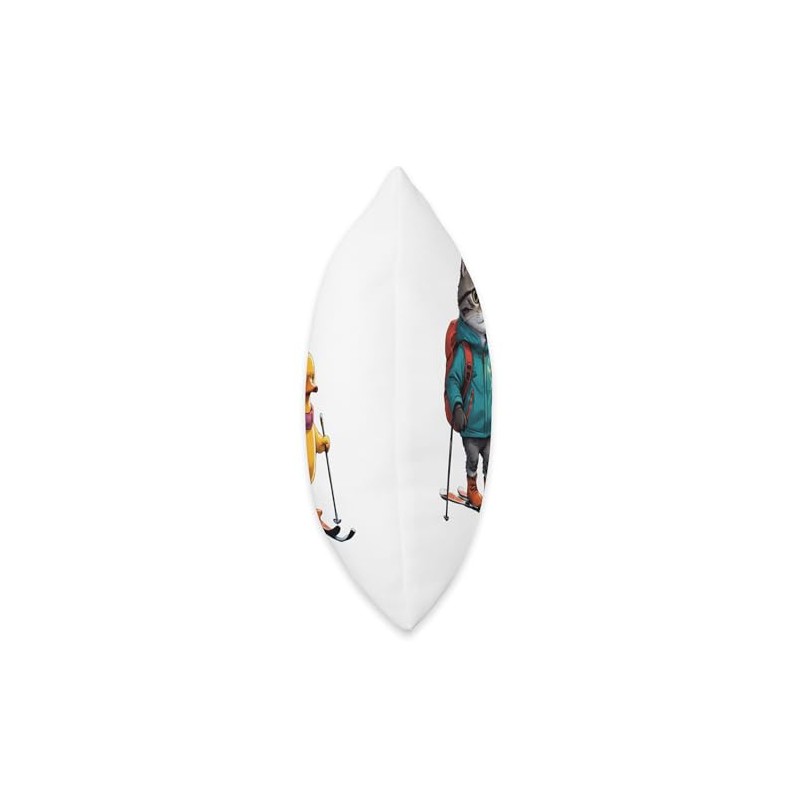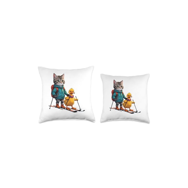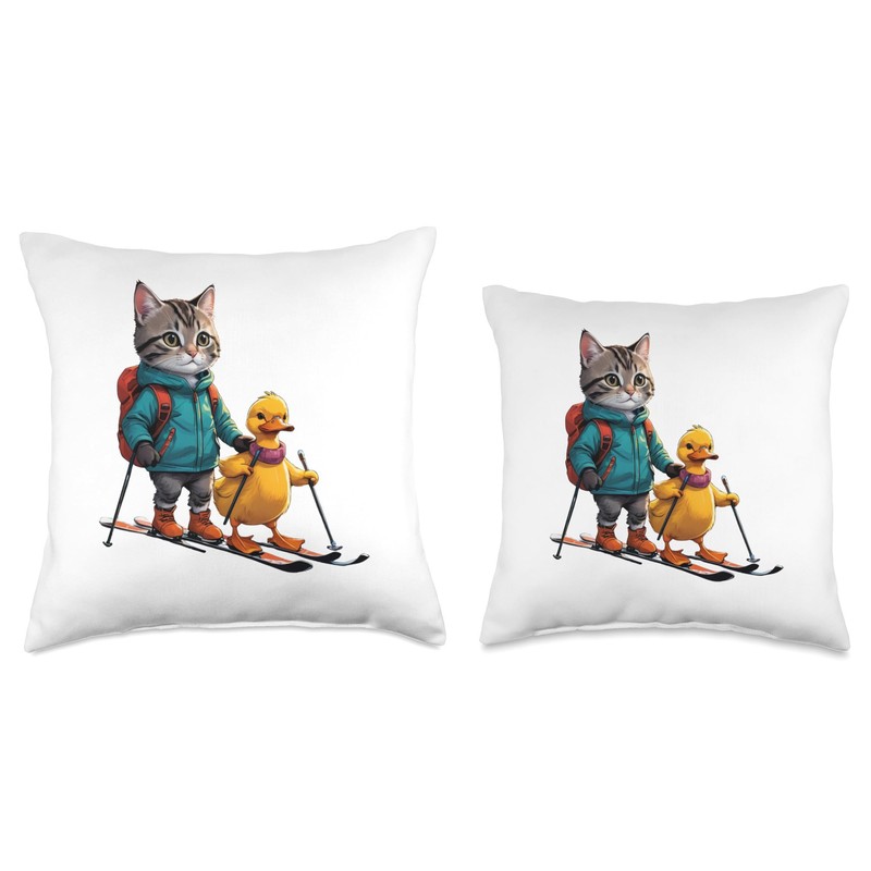 Little Cat and Duck Skiing On Field Funny Animal Lover Gift Throw Pillow