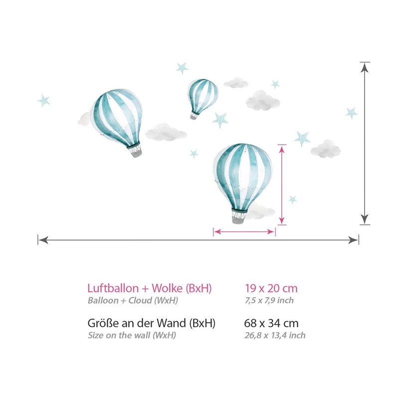 - Box contents: a wall sticker with hot air balloons, the picture corresponds to 68 x 34 cm and the balloon element has a size of 19 x 20 cm (width x height).