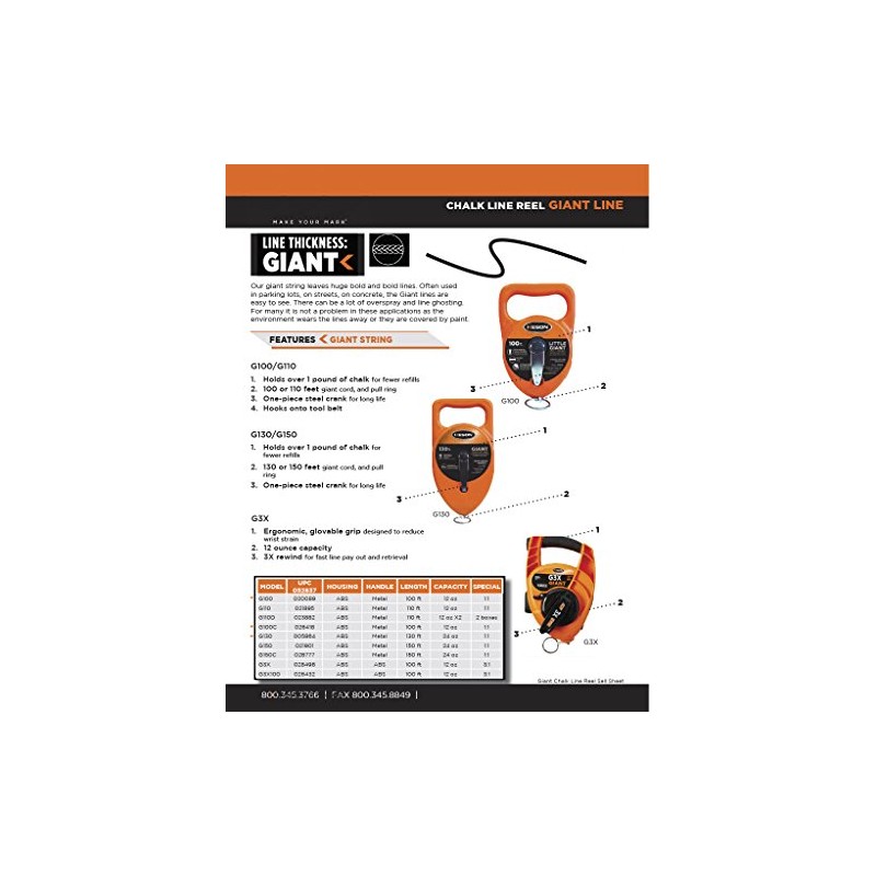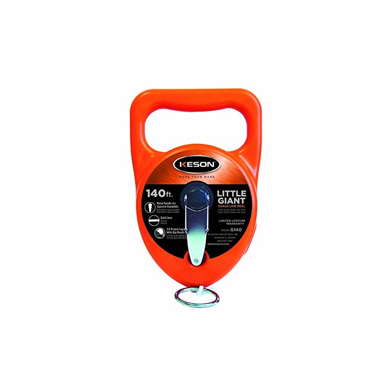 Keson Giant Chalk Boxes are the world-Feets premier large chalk boxes. G140FL has 140-Feet of string and holds up to a pound of chalk. Fine Line (FL) is thinner than traditional Keson Giants. Patented "Big Mouth" opening is easy to fill and no leak stopper keeps chalk in box. Large hand hold for "glovable" grip in cold weather. Steel crank handle and ABS plastic hold up to harshest conditions.