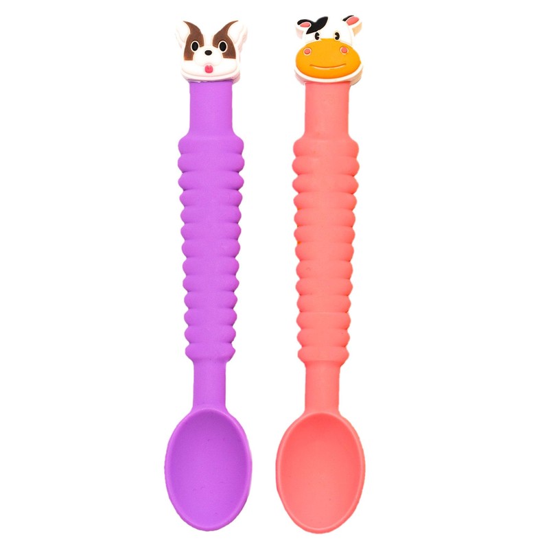 Little Grubbers 3-in-1 Baby Spoon™ – Soft Silicone Self-Feeding Utensils for Baby Led Weaning, Easy Grip, BPA-Free, Dishwasher Safe, 2-Pack – Dog & Cow