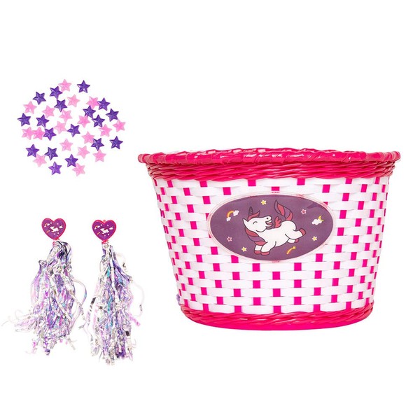 Little Jupiter Unicorn Bike Basket, Streamers, & 36pc Star Spoke Decoration Set for Girls (Pink/White)