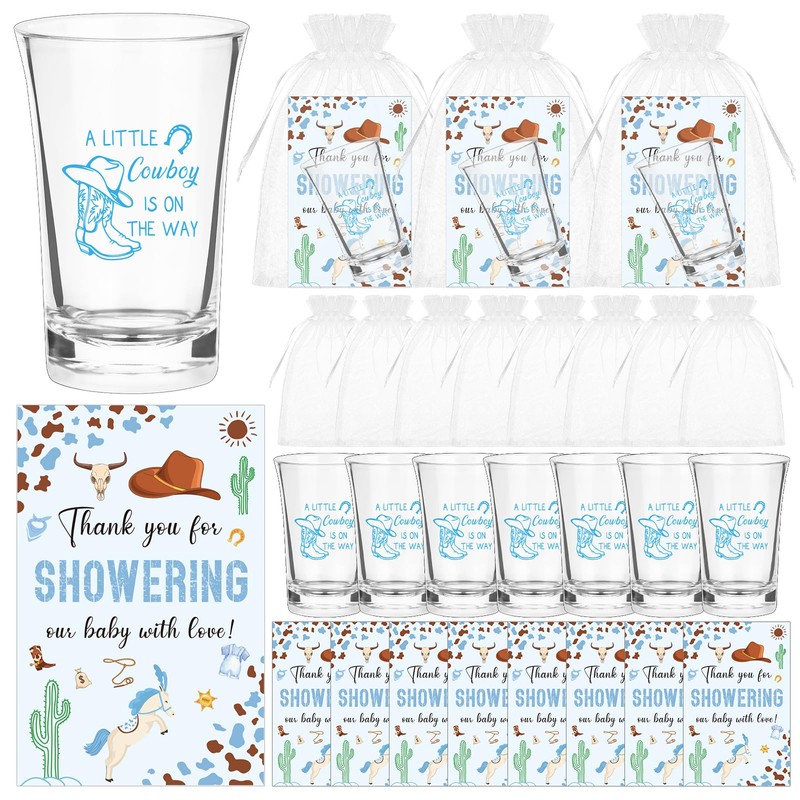 LIUBUJINGYING 60 Sets Western Cowboy Baby Shower Acrylic Shot Glasses A Little Cowboy is On The Way Shot Glasses with Thank You Cards Organza Bags for Gender Reveal Cowboy Themed Birthday (Blue)