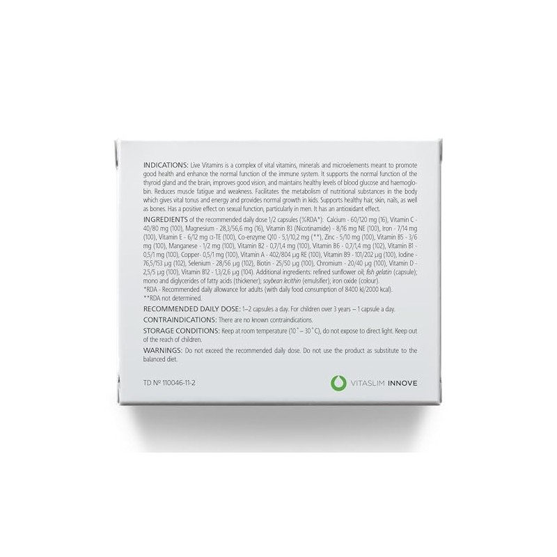 - COVERS 100% OF YOUR NEEDS. 1 capsule Live Vitamins delivers an optimal amount of all vitamins and minerals needed by the body to function properly. Effective in adults and children.