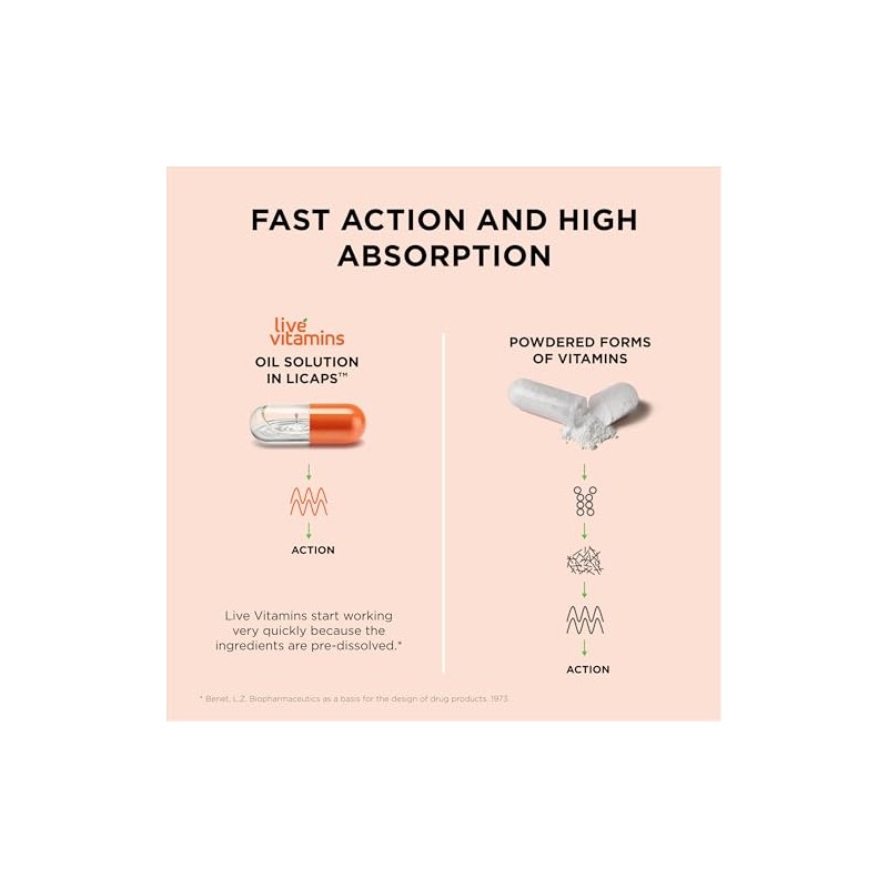 - FASTER EFFECT. The useful substances are in oily form. They are absorbed to the maximum extent. The effect of Live Vitamins is faster and noticeable compared to powdered multivitamins.