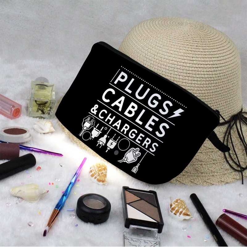 - 3.Good Size:8.65 in* 2 in* 5.35 in. 25 grams weight. The PLUGS CABLES & CHARGERS cosmetic bag is easy to carry makeup tools like lipsticks, eye shadows, brushes, sunscreens, etc. The makeup bag is also able to carry stationery, medicines, coins, cards and other personal effects