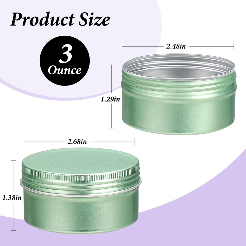 • 3 oz Tins - Capacity: 3 ounces / 90 ml; Dimensions:2.68" dia. x 1.38" height; Each 3 oz tin can be filled with 90ml of liquid water (Note:If you are a candle making enthusiast,please base on the density of your candle to calculate how many milliliters of your liquid candle that the metal tin can hold)