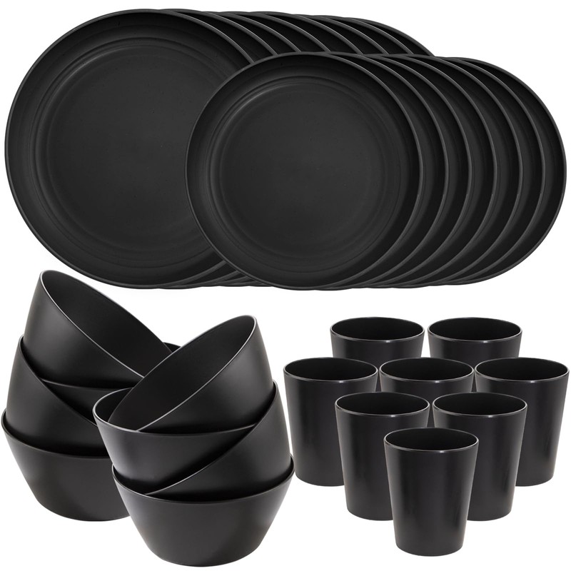 LIYH 48pcs Black Wheat Straw Dinnerware, Plates and Bowls Set, Camping Dish S...