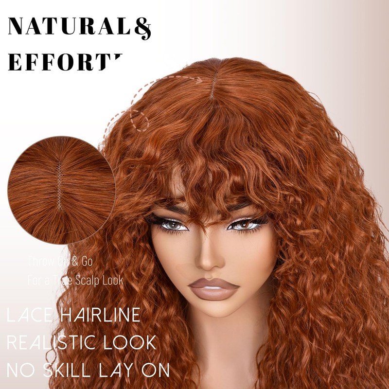 Lizzy Giner Curly Wig with Fringe for Black Women, Long Curly Human Hair Wig without Glue for Daily Use, Realistic Look with Real Hairline