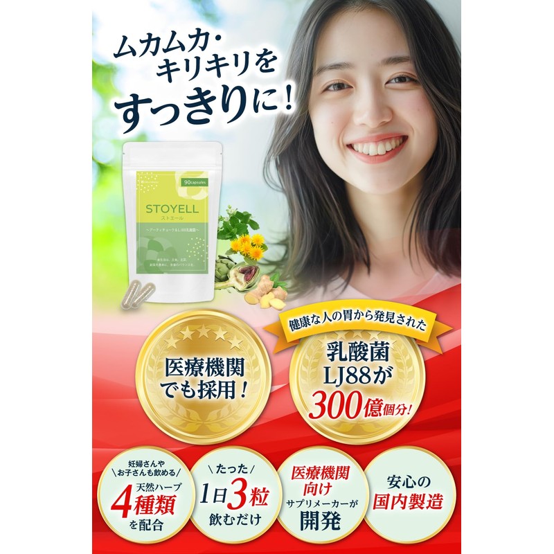 【ムカムカ・キリキリに】【医療機関も採用】乳酸菌 LJ88 サプリメント アーティチョーク 生姜 レモンバーム ストエール 90粒入り