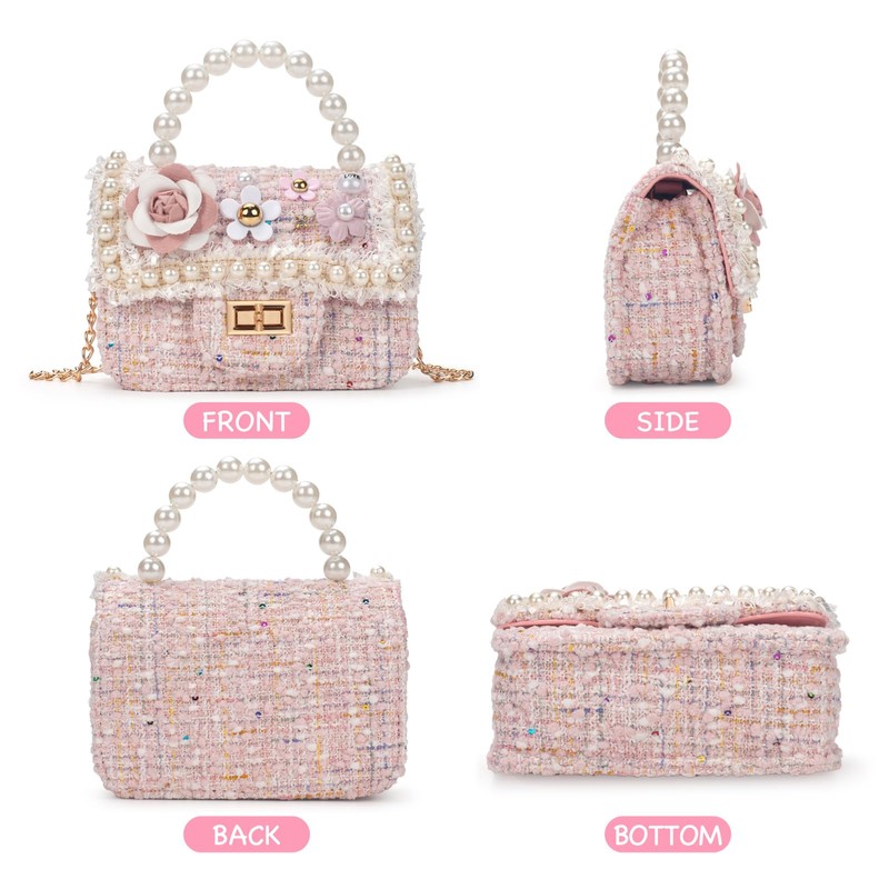 - Premium Quality: This kids purse is made of premium soft tweed fabric, PU leather and designed with Pearl & Flower decoration, which is stylish and beautiful. The shiny gold-colored hardware is reliable and durable to use for a long time.