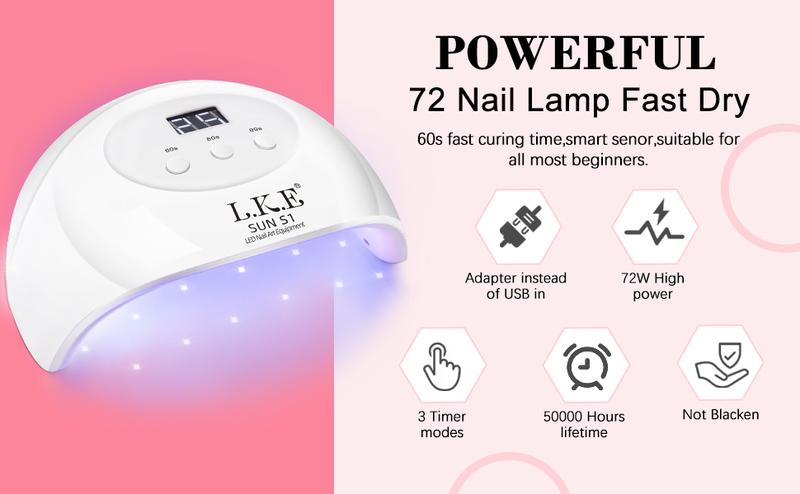 - ️Powerful 72W UV Lamp for Gel Nails: LKE uv light for nails with UV+LED 365+405nm dual light source is applicable to curing almost ALL nail gels. Smart auto sensor and Clear display screen, 3 timers durable and easy to use. You can curing toes and enough space to enhance the experience. Ideal for both home and salon use