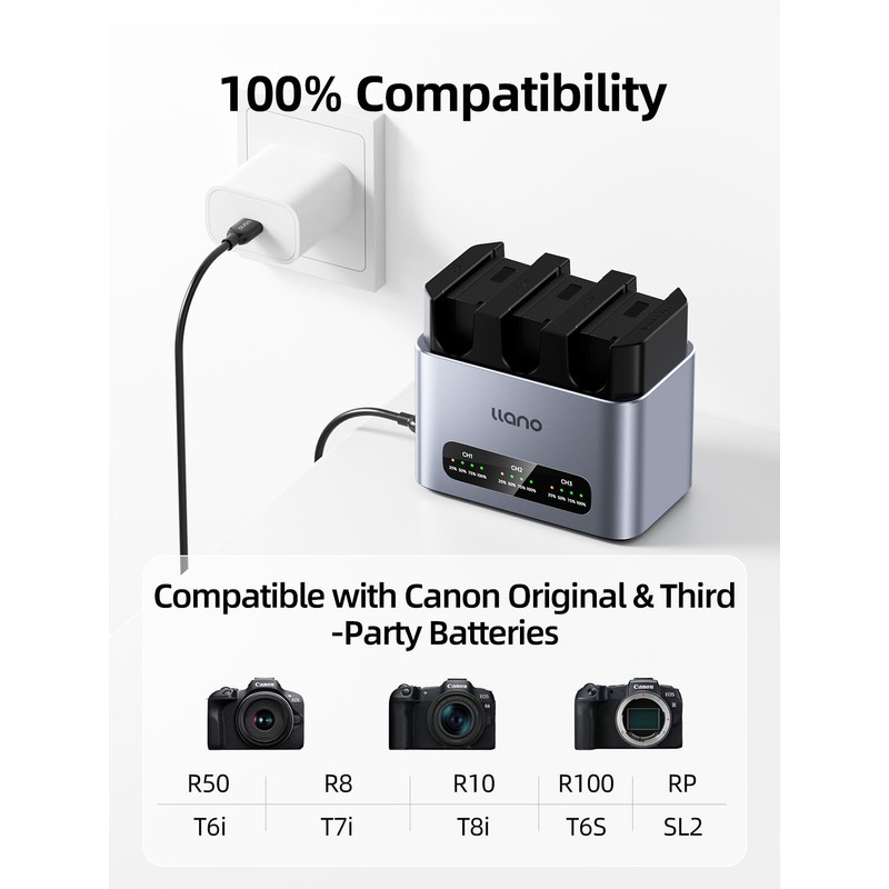 llano LP-E17 Battery Charger Set comes with 3 pack LP-E17 Batteries and a sturdy USB-C charging cable, can charge three pack batteries at the same time, perfect for Canon LP-E17 batteries.