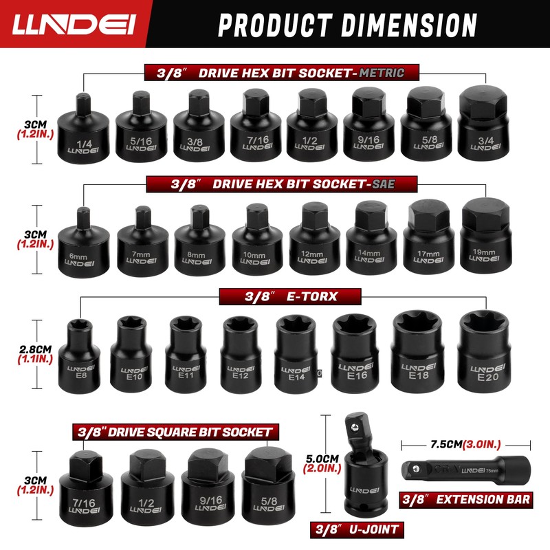 LLNDEI 3/8 Inch Drive Low Profile Impact Hex Driver Set, 30-piece SAE/Metric 1/4-3/4 Inch & 6-19mm, with E-torx Bit Socket Set E8-E20, Square Bit Socket, U-Joint Extension Bar, Cr-Mo, Storage Case