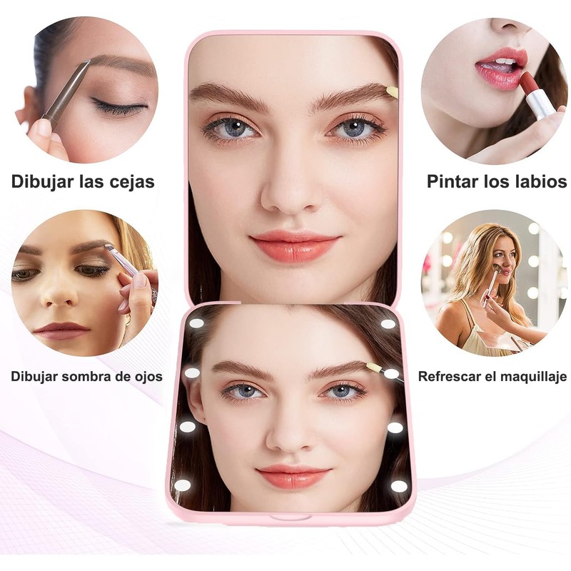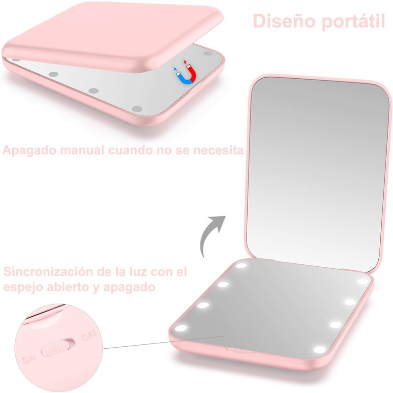 • 🪞【CON FUNCIÓN AUMENTO】 Espejo de bolsillo viene con dos tipos de espejos, el espejo plano 1x con 8 bombillas LED muestra su cara con claridad, no importa en la luz del día o cualquier ambiente tenue; el espejo de aumento 2x es mejor para los primeros planos en los retoques de maquillaje (especialmente maquillaje de ojos).