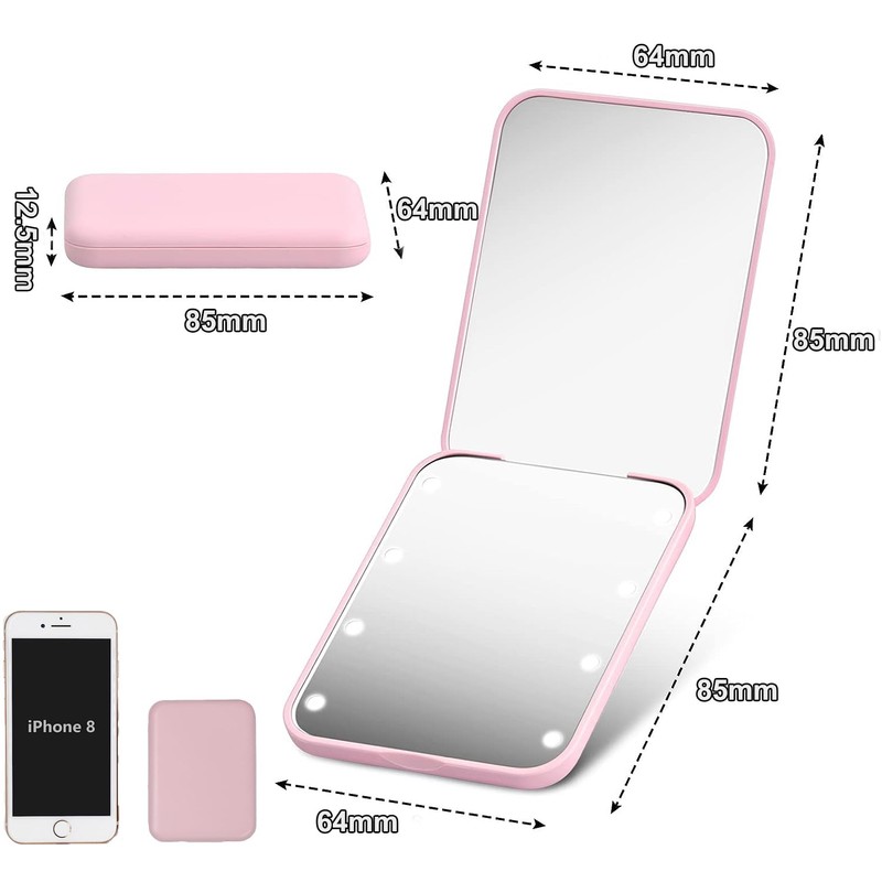 • 🪞【ASPECTO BONITO Y LIGERO】 Espejo compacto LED mide 85 mm * 64 mm y tiene un grosor de 12,5 mm. Esto hace que el espejo de tamaño de viaje sea más adecuado para carteras, bolsos, bolsillos, trabajo diario, citas o viajes.