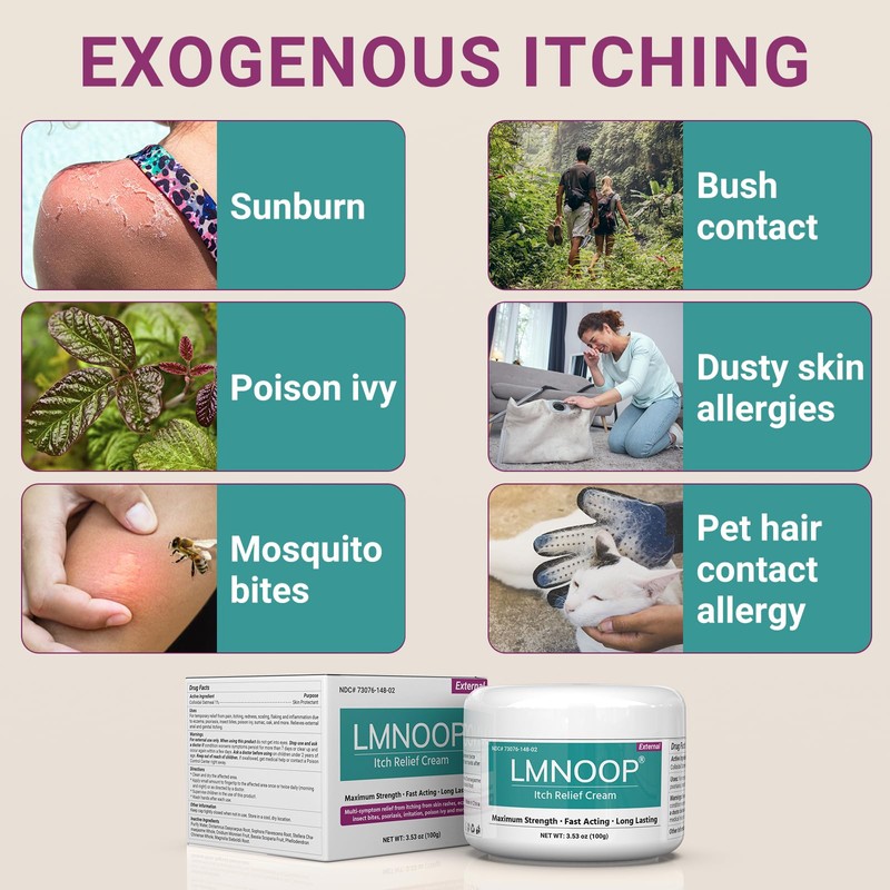 - Effective ReliefLMNOOP Itch Relief Cream relieves most outdoor itches such as insect bites, sunburns, pet hair, dust contact allergies, as well as rashes and itching caused by poison ivy, oak and sumac.