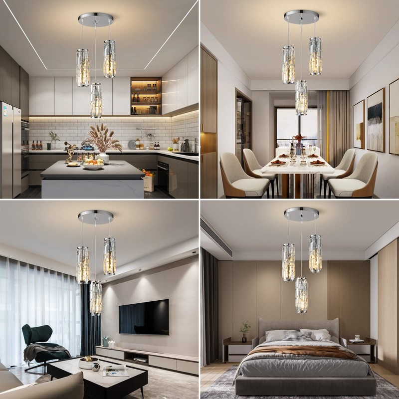 LMQNINE 3 Light Chrome Pendant Lighting Modern Pendant Light, Mini Crystal Chandeliers,Adjustable Pendant Light Fixture for Kitchen Island Dinning Room Bedroom (Chrome 3-Light)