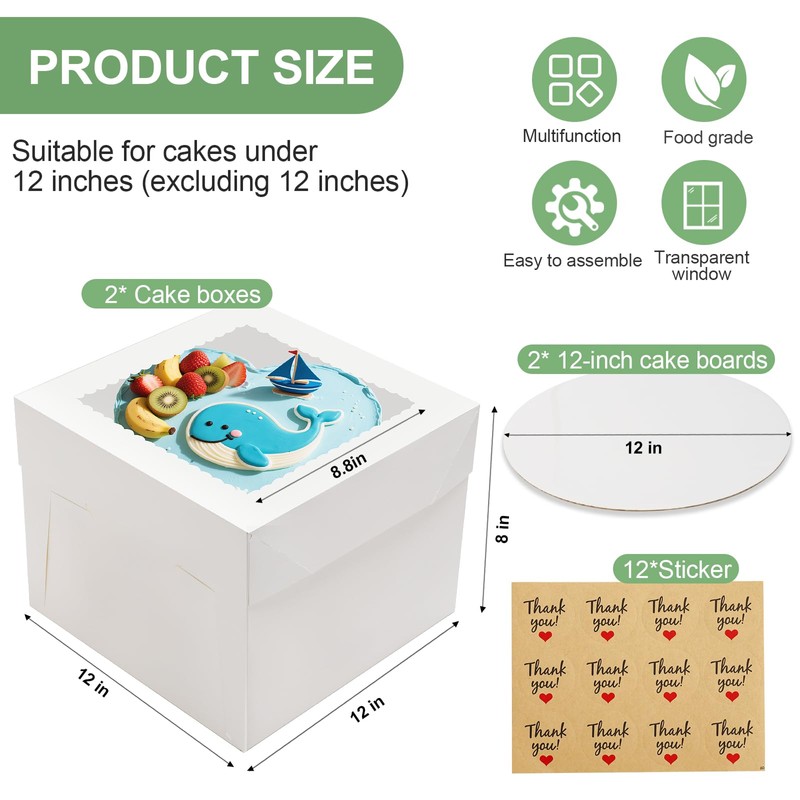 • Quantity and Size2 pack 12x12x8 inch cake boxes, 2 pack 12 inch cake boards for multiple uses, 12thank you stickers make your gift full of love. The classic and versatile white cake box is perfect for holding beautiful cakes.