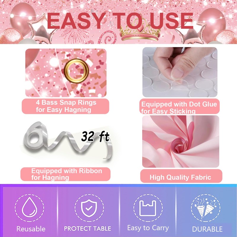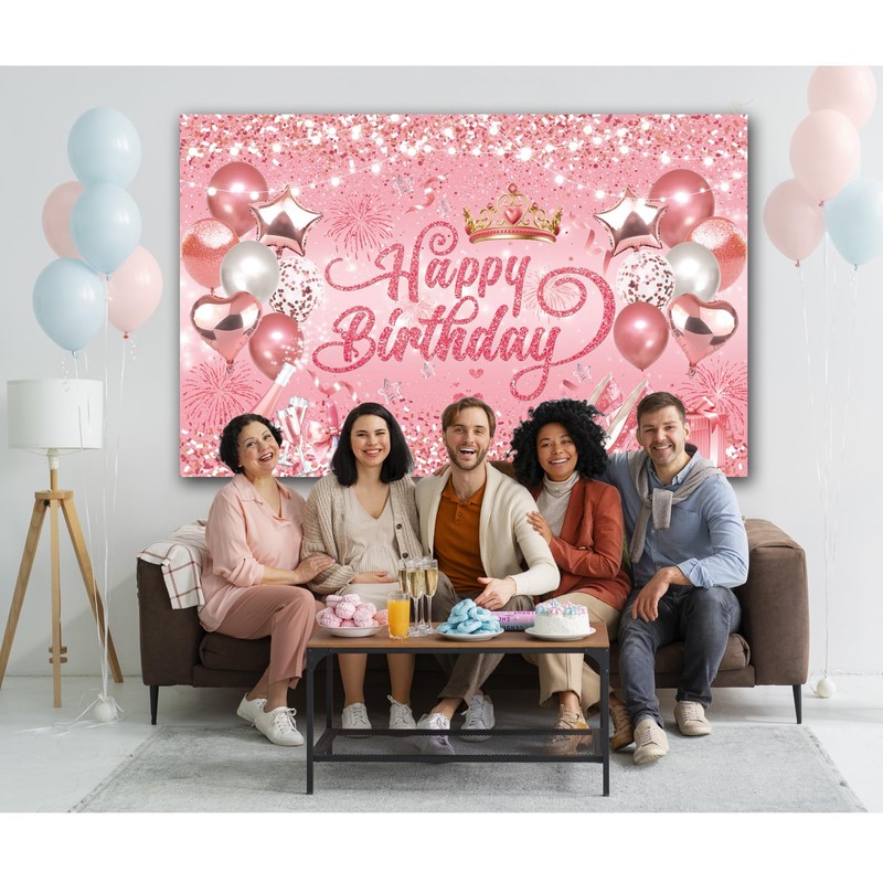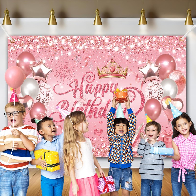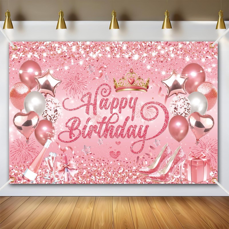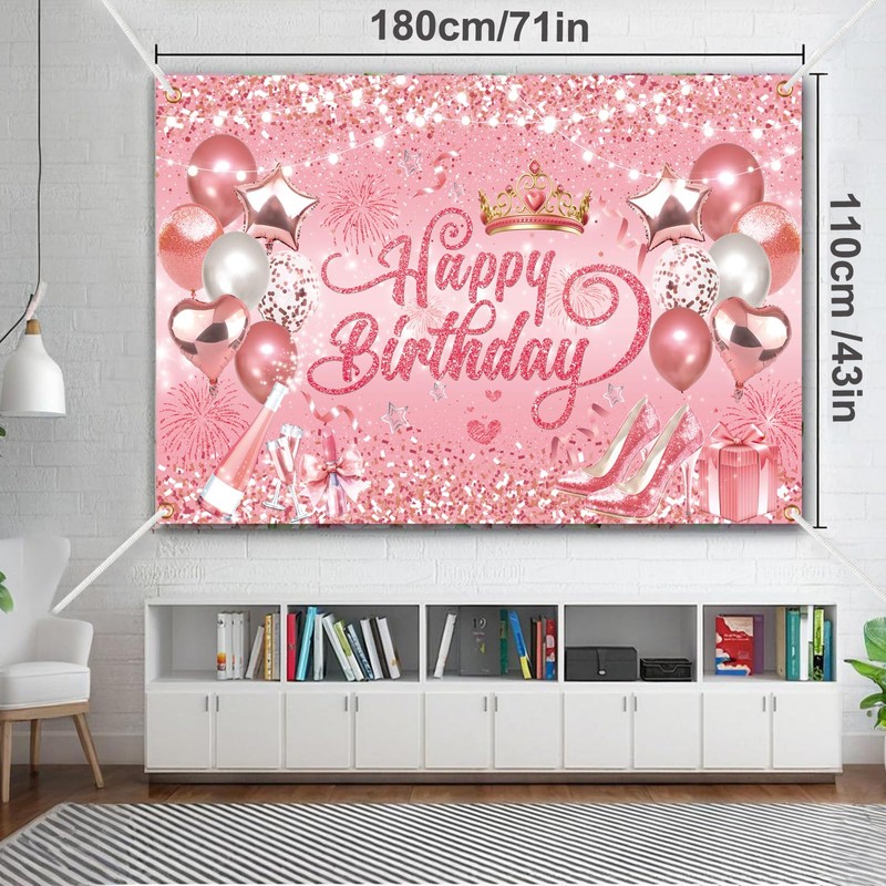 - This pink backdrop is printed with crowns, two balloon chains, champagne glasses, lipstick gifts, high heels, and the words "happy birthday". It immerses girls in a sea of pink, creating an unforgettable and enchanting atmosphere for their birthdays.