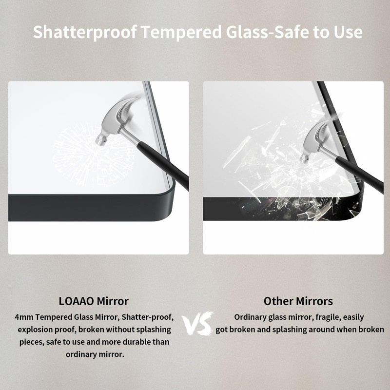 - 【Sturdy Mirror with Premium Materials】: LOAAO black metal mirror is built with 4MM tempered glass which features shatter-proof, burst-proof; Aluminum alloy frame which features anti-rust; Ideal for using in bathroom; Solid and sturdy; Durable for use