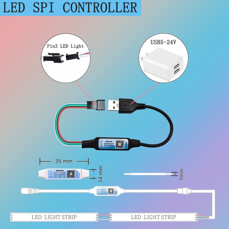 - SP621E controller supports 5V WS2812B and 12V/24V WS2811 LED strips or strings. It cannot control LED lights powered by an IC other than WS2812B or WS2811, as well as normal RGB lights without IC driver. USB input for easier power supply.