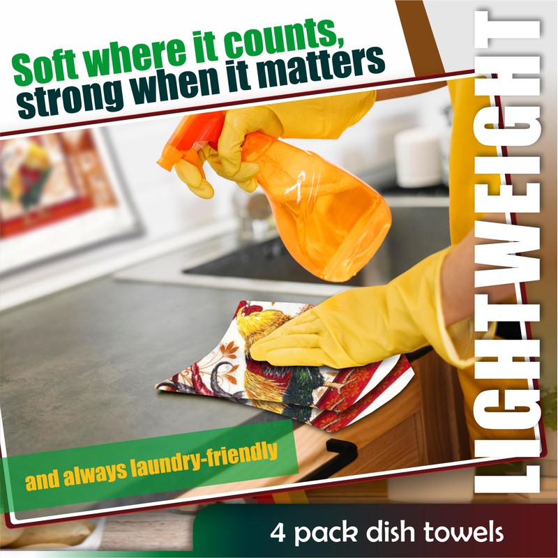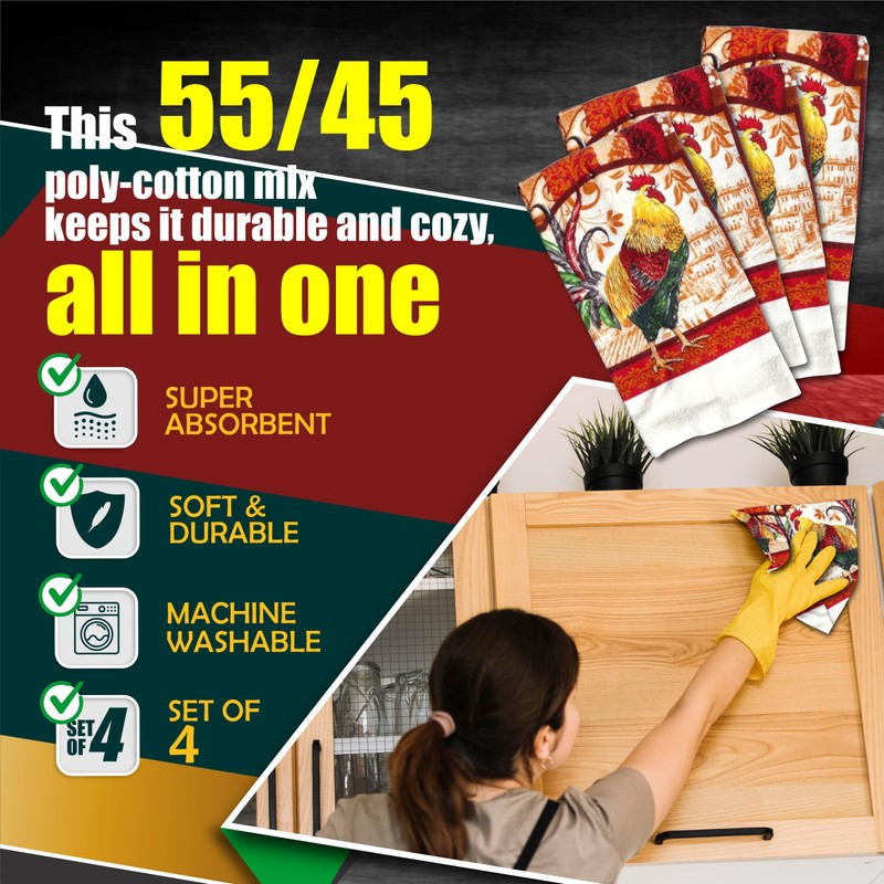 Lobyn Value Packs – 4-Pack Red Rooster Kitchen Towels, 15x25 Lightweight Cotton-Poly Blend, Absorbent Dish Towels with Farmhouse Country Design