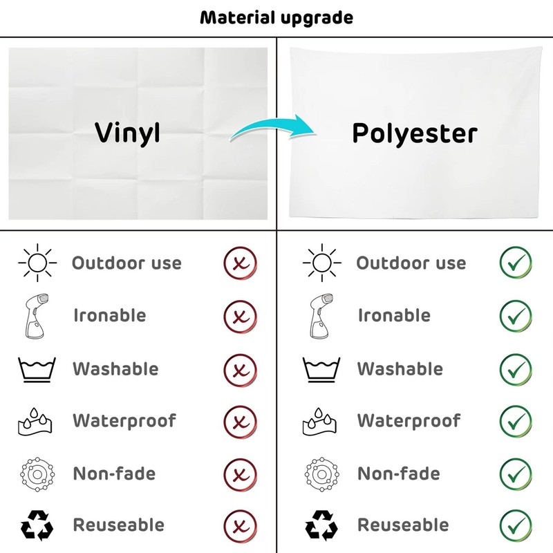 1. Material: polyester cloth, it is an upgraded material, compared with vinyl it has Washable, ironed, and non-fading advantages.