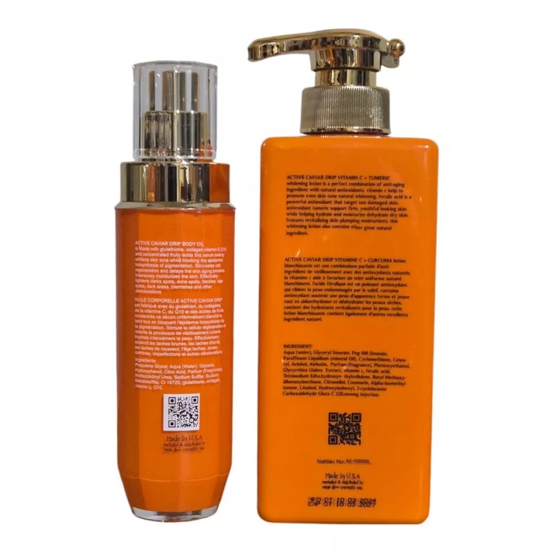 Set completo con loción corporal (444 ml), aceite facial (100 ml) y crema iluminadora con cúrcuma, vitamina C y caviar activo. 🌿💛 Hidrata, aclara y rejuvenece tu piel desde el primer uso. ¡Luce radiante todos los días! 🧴🌟