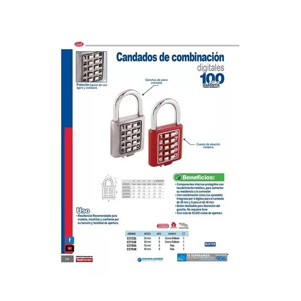- Combinación única (no ajustable) de 5 dígitos