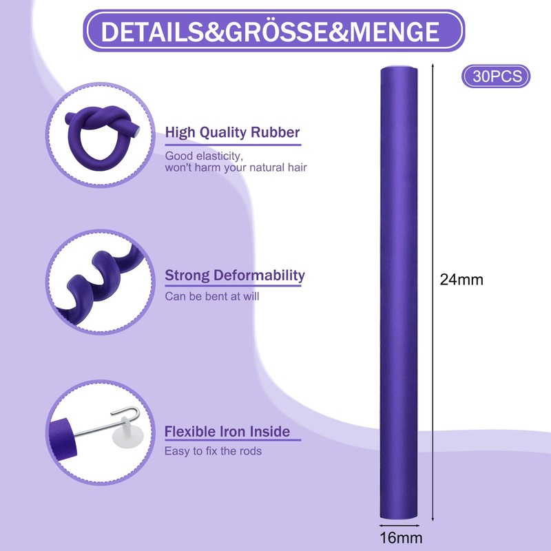Locken Ohne Hitze Lockenwickler, 30 Stück Flexible Lockenstab 250mm mit Durchmesser ø16mm, Twist Schaum Lockenwickler, Overnight Curls Langes Haar Frisur Design(Violett)