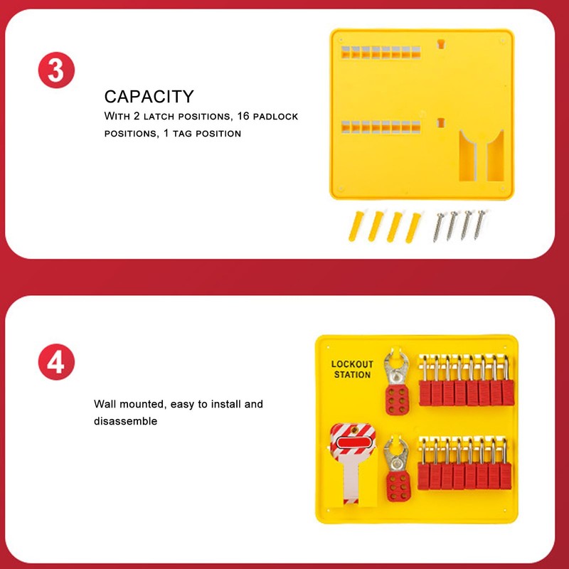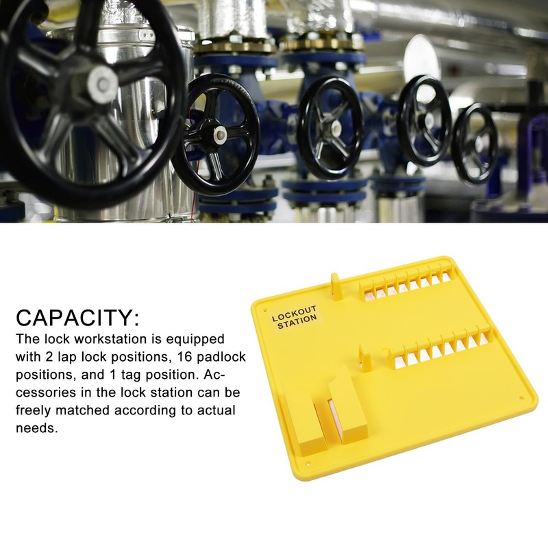 - LARGE CAPACITY: The open locking workstation is equipped with 16 padlock positions, 2 hitch lock positions and 1 hang tag position, which can be freely matched according to the actual demand to ensure that the equipment is in a locked state and safe to use in the process of use.