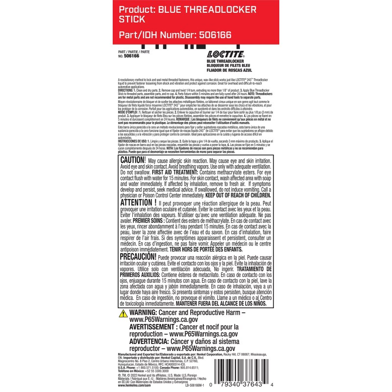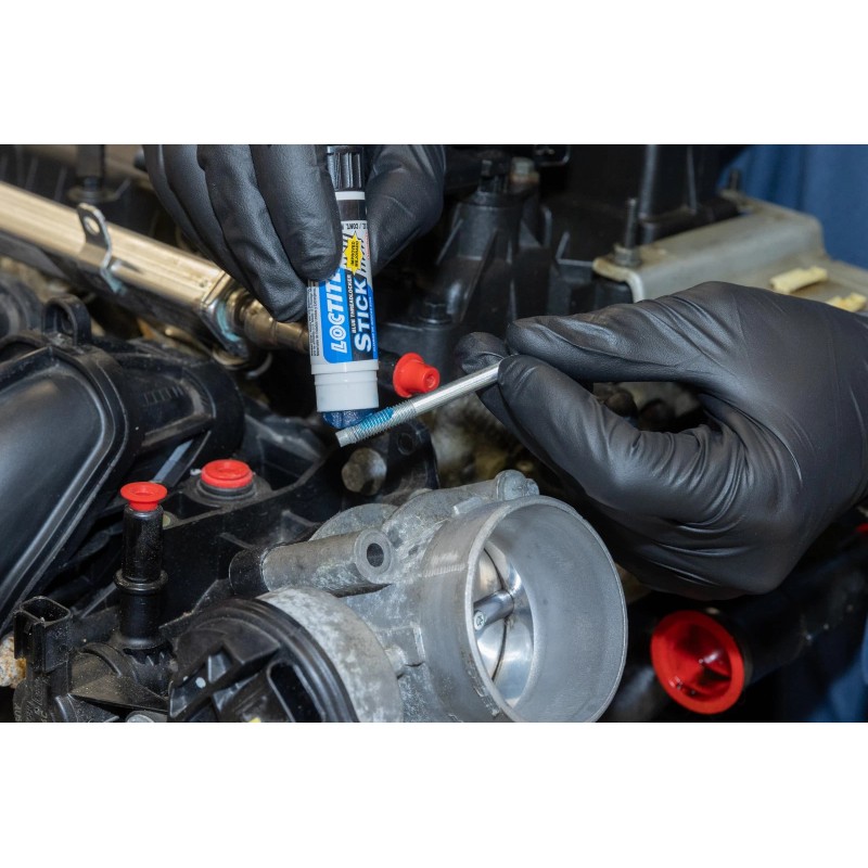 LOCTITE 248 Blue Threadlocker Glue StickThis medium-strength anaerobic threadlocker offers the same locking strength and sealing capabilities as our premium blue threadlocking liquid, LOCTITE Threadlocker 243. This wax-like stick is conveniently packaged in a self-feeding stick applicator. It is well-suited for difficult repairs, as in overhead applications. It can be applied to a part even if assembly if to take place at a later time, making the stick ideal for volume assembly. Removable with hand tools.Convenient, Portable & EffectiveFormulated as wax-like, semi-solid adhesives packaged in a self-feeding stick applicator, LOCTITE 248 Threadlocker Sticks provide robust cure even on oil-contaminated or inactive metals like stainless steel. Invented by Henkel as a revolutionary method to positively lock and seal threaded fasteners, LOCTITE threadlocker adhesives are used in a wide range of applications from delicate fuel injection components to heavy-duty transmission and engine assemblies. Specified by automotive OEM's and approved for use on factory assembly lines, threadlockers work by filling the spaces between threads. The result is a secure, one-piece assembly that will not loosen under stress.Won’t Drip, Leak or Melt! Perfect For Overhead ApplicationsThese convenient and portable products will not leak or drip when carried in a pocket, stored in a toolbox or used in an overhead application. The sticks are designed and as easy to use as Henkel’s well-known Pritt Sticks for consumers. LOCTITE 504466 threadlocker sticks deliver the same proven performance as the well-known liquid LOCTITE threadlockers: they secure threaded assemblies, fill gaps between threads, and prevent loosening, leaks and corrosion.Removable with Hand ToolsLOCTITE 504466 Medium Strength Blue Threadlocker Stick is applied to a threaded fastener and can be disassembled using hand tools. This anaerobic adhesive is typically used for machine tools, presses, pumps, compressors, mounting bolts and gear boxes that require maintenance or servicing. The product works on all metals, including passive substrates such as stainless steel, aluminum and plated surfaces. It is proven to be tolerant of minor contamination due to industrial oils, e.g., motor oils, corrosion prevention oils and cutting fluids.LOCTITE automotive aftermarket products are not just OEM-specified, they are also designed by auto manufacturers and lab tested. Engines of nearly every professional race car are assembled and maintained with LOCTITE brand adhesives, sealants, gasket makers, and coatings. Whether gasoline or diesel, from bolts and gaskets to cooling lines and core plugs, Henkel products are used to seal, secure, and repair vehicle components.