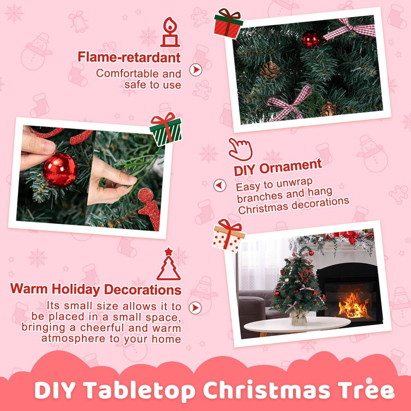 - 【Lighted Tabletop Christmas Tree】This 24inch tabletop Christmas tree has a realistic appearance and branches, giving you the most intuitive feeling of Christmas. Besides, the warm white string light with a built-in timer can be freely installed to give a luminous effect that fits your needs.