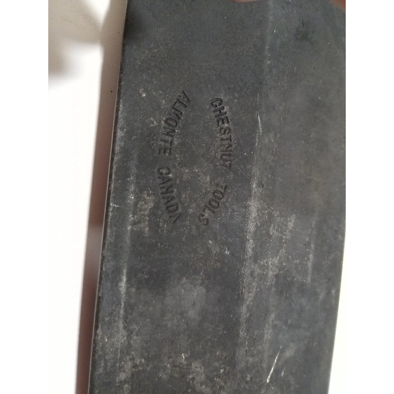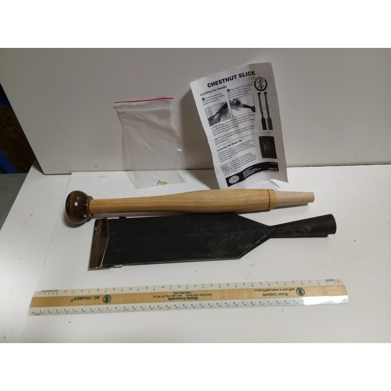 A completely unused and well-preserved Chestnut log builders slick. Made by Chestnut Tools. Blade portion is 15 and 1/2 in by 3 and 1/2 in. Handle is about 17 in by an inch and a half. Overall length while assembled is about 30 in.
