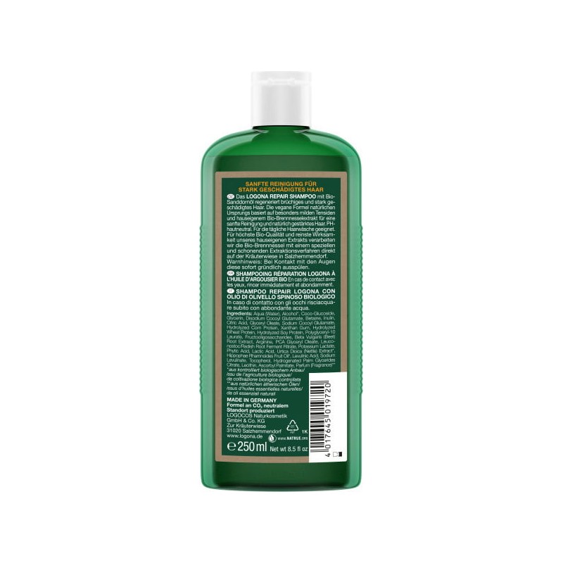 The shampoo by LOGONA is specially formulated for damaged and brittle hair types. A precious complex composed of plant-based protein sources, mild surfactants and organic stinging nettle extract provides a gentle cleansing action while organic sea buckthorn oil lends the hair a supple and nourished feel.