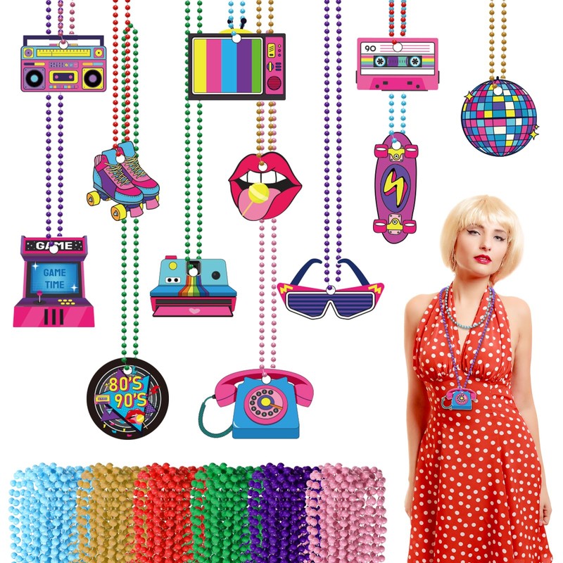 • Vintage design: 12 different styles of 80s 90s party accessories with classic retro elements such as 80's 90's, disco balls, radios, landline phones, video games, roller skates, skateboards, sunglasses and more. The cute retro disco pearl necklaces bring the retro style effortlessly to your outfit and make you stand out from the crowd.