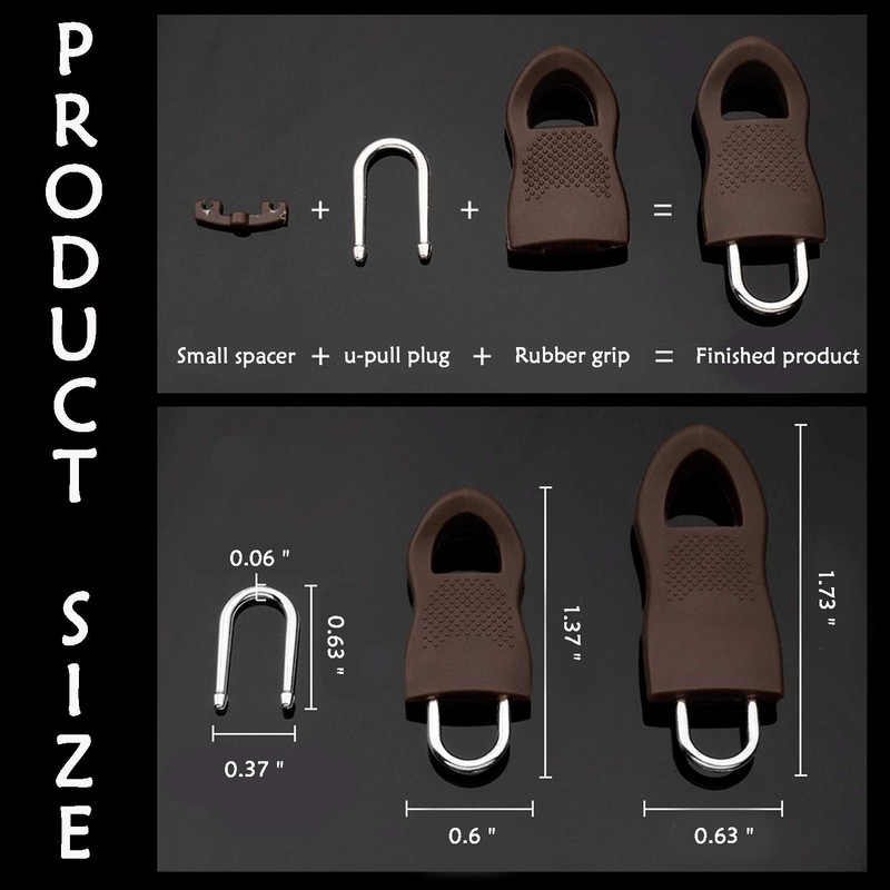- - Dimensions - U-shaped zip fixers are available in 2 sizes, a total of 6 pieces, 3 x small fixers (1.8 x 0.64 x 0.2 inches); 3 x large fixers (1.4 x 0.6 x 0.2 inches).