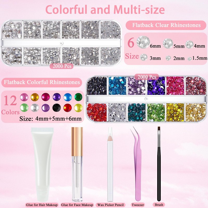 - Colorful and Multi-size: This hair gems set provides 1 box of 12 colors flatback rhinestones(4 mm, 5 mm, 6 mm); 1 box of clear rhinestones with 6 sizes(1.5 mm, 2 mm, 3 mm, 4 mm, 5 mm, 6 mm)